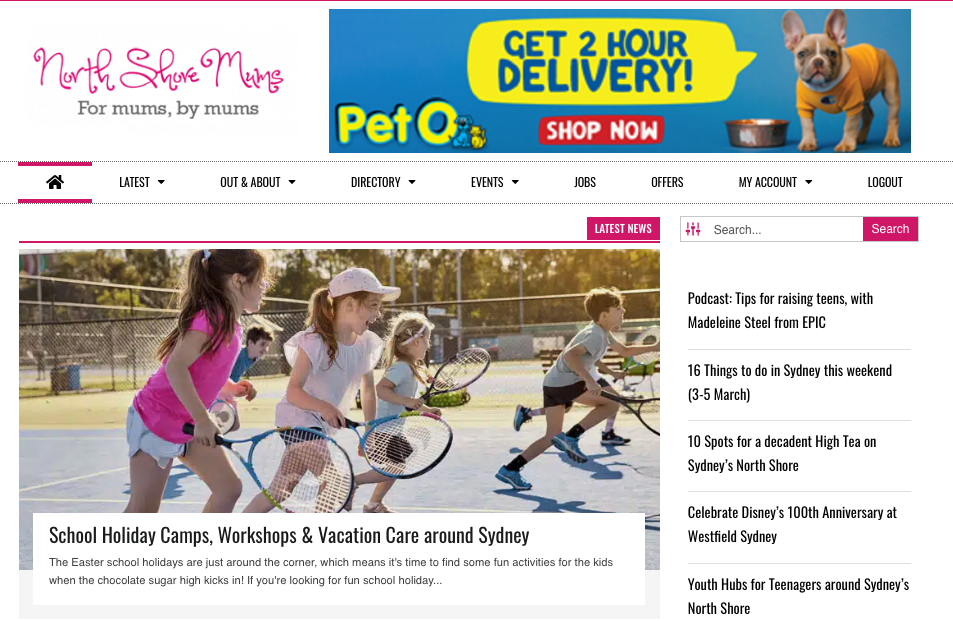 - Website (100,000 visits/month): Featured listing in the School Holiday Guide article on northshoremums.com.au. This includes the event name, description, image, special offer (if applicable) and booking details. This campaign will feature on the North Shore Mums homepage for at least one week and also in the Essential Guides section until the end of the holidays.