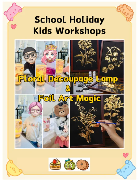 Floral Decoupage Lamp & Foil Art Magic: Your children will explore the delicate art of Floral Decoupage and create dazzling artworks using heated foil techniques. They’ll explore textures, colours, and metallic effects while building fine motor skills, and create unique decorative work perfect for display at home.