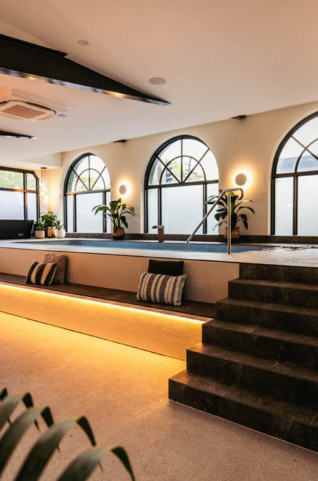 Escape Bathhouse is located within the heritage-listed Seymour Building in Chatswood, renowned for its beautifully preserved Spanish Mission architecture. Spanning 320 square metres across two levels, the space has been thoughtfully transformed into a tranquil, light-filled bathhouse that blends timeless character with contemporary wellness design.