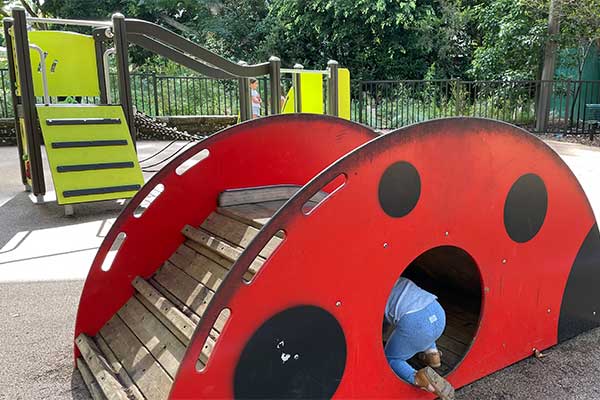 It’s not just the older kids that are well catered for here, the younger tots have a separate area with a tunnel, slide and mini jungle gym. It’s the perfect height for babes that have just learnt to walk or kids who aren’t so comfortable with heights quite yet. There is a set of three swings, including one for toddlers and a large net swing.